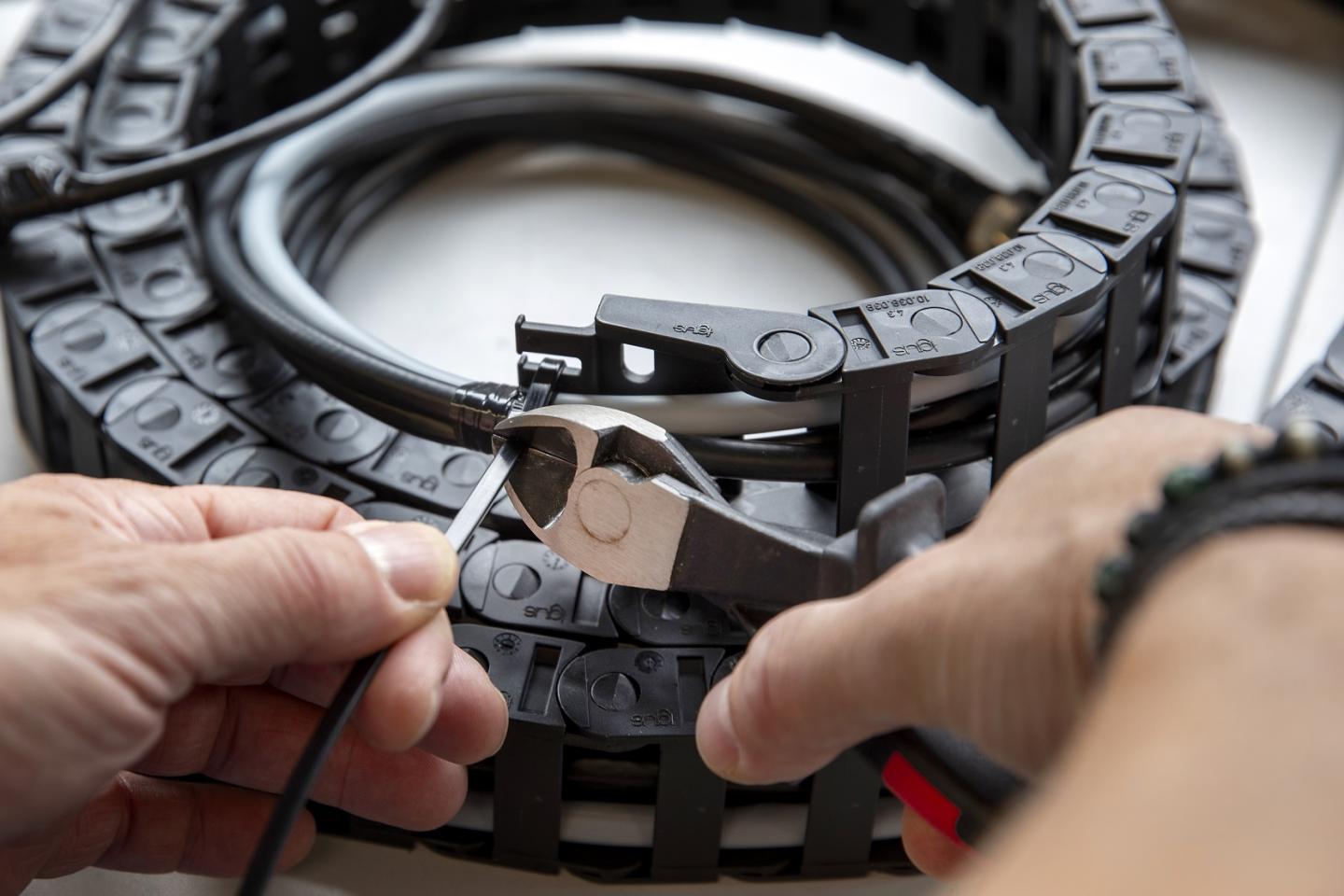 Kabels worden vastgezet in de beschermrups. Zo raken ze niet beschadigd als ze samen met de camera omhoog worden gestuurd om over het terrein heen te kijken.