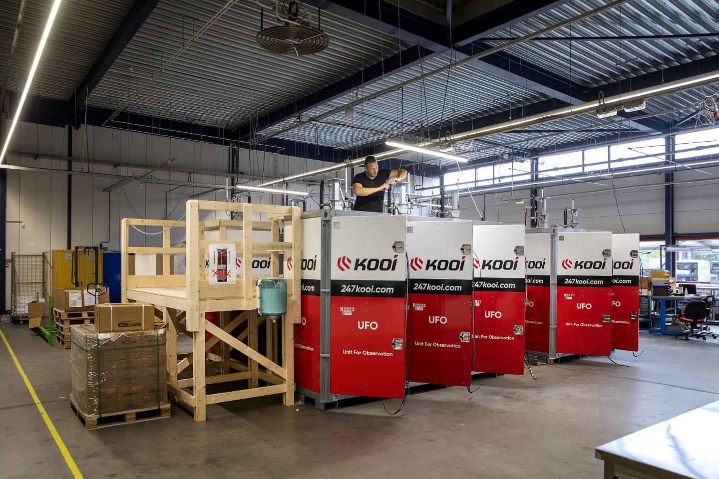 De houten stellage is speciaal voor dit Kooi-project gemaakt, zodat de medewerkers op hoogte kunnen werken. Prettig én snel. Per week maakt Caparis maar liefst tien UFO’S.