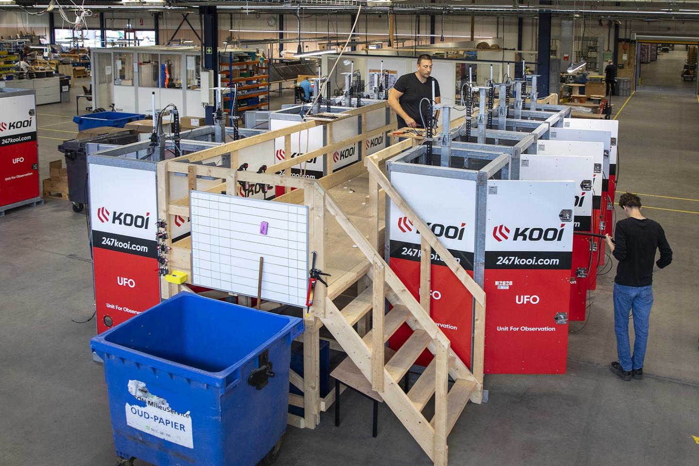 Liggen alle subonderdelen klaar in het magazijn? Dan mogen ze per tien weer terug naar de werkplaats. Een vast team van vier medewerkers monteert ze daar in de UFO.